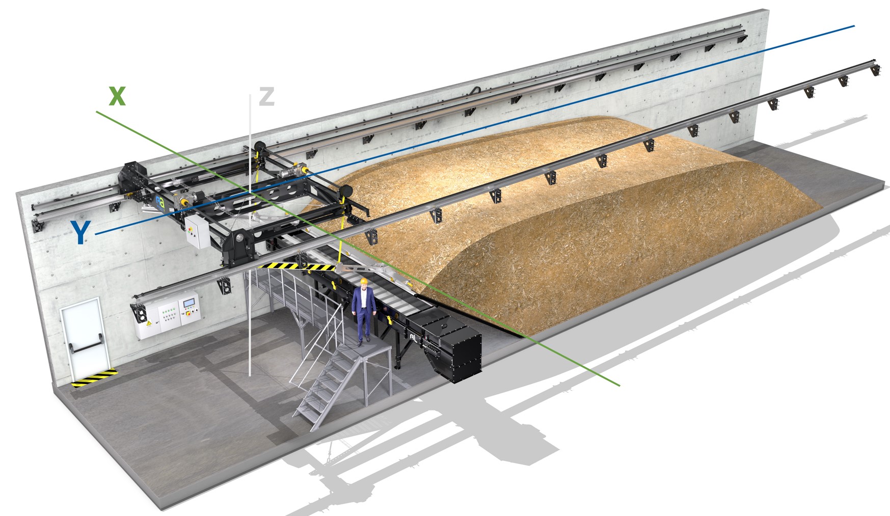 - Un chariot automatique équipé d’un râteau déplace la biomasse et l’achemine vers un convoyeur d’extraction.